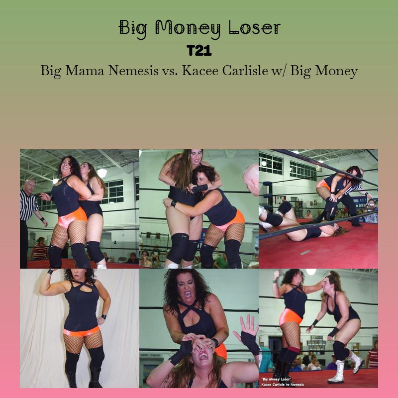Nemesis seems to have victory on her horizon when she splashes Kacee in the corner, but after she whips her to the opposite turnbuckle for a repeat, she’s met with a solid boot to the chest, and now it’s Carlisle’s turn to seize control… and she makes the most of it! The Champ finds herself on the receiving end of a real beatdown, including being choked on the ropes as Kacee snarls to the crowd, “Look at her… she’s nothing!” And adding to Big Mama’s woes are the cheap shots which Big Money manages to sneak past the ref.