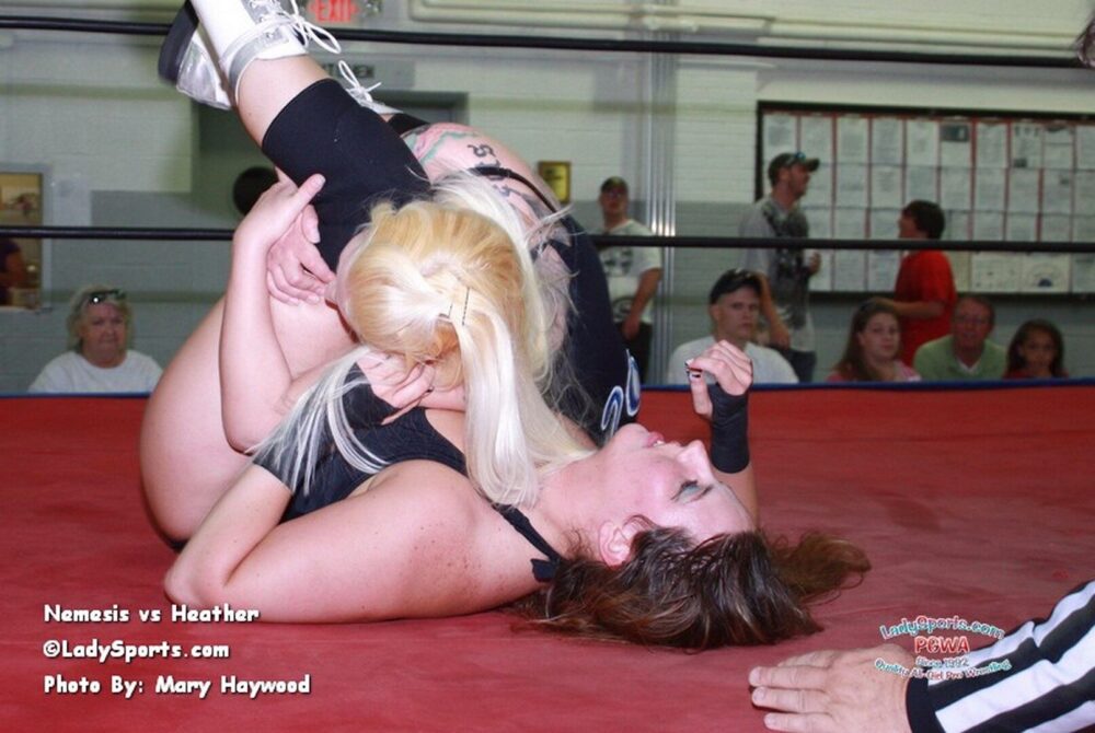 Of course, Nemesis has her own ideas about just who’ll be taking a beat down on this night. And as if she doesn’t have enough reasons to want to win this one, it’s also her very first title defense since beating Heather Owens for the PGWA belt, and she intends to make damned sure she doesn’t go down in history as the champ with the shortest title reign!